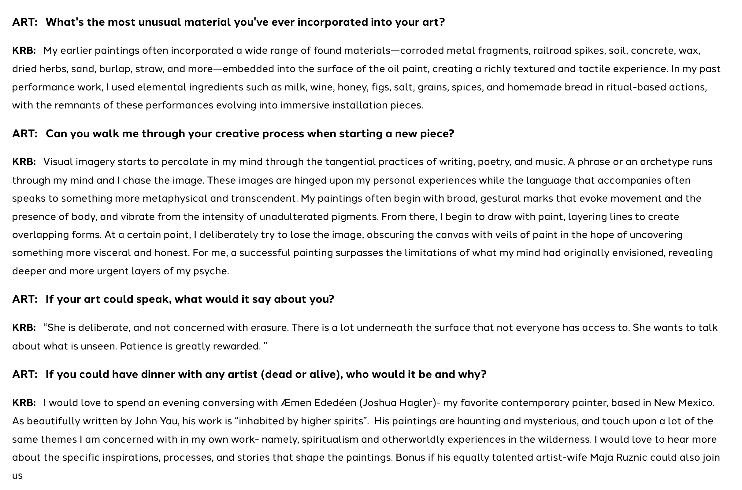KB: I think I am someone who would be pretty unhappy doing anything other than painting. Painting gives me a profound sense of purpose and is dynamic and challenging enough to keep me constantly and consistently engaged. I have tons of other interests and sometimes regret not having more time to fully devote myself to additional practices; in another life, I could be a mountaineer, a naturopathic doctor, a professional cellist, a writer, a photographer, a wildcrafting herbalist, a motorcycle racer, a speed skater, among many other things. I find life to be infinitely interesting. But devotion to my artistic practice takes precedent, and all of the decisions in my life have been towards furthering my progress as an artist. All of my "day jobs" have been arts related. I have held a number of positions relating to arts education, worked in three arts museums, worked as a research assistant for a grant writer securing funding for arts organizations, and am currently working for an art advisor & curator. Art has always been the center of my life.